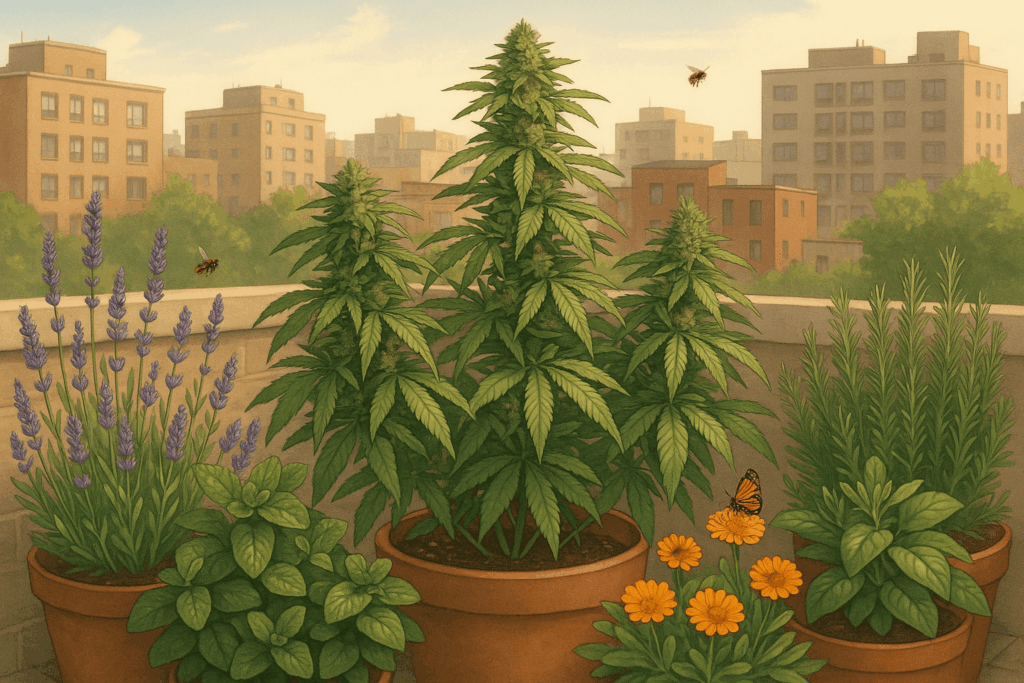 Durante la floración puede ser difícil de controlar en entornos urbanos, y no hay soluciones mágicas para eliminarlo por completo. La mejor estrategia es camuflar el aroma plantando otras plantas aromáticas alrededor del cannabis. Algunas opciones efectivas son: menta, lavanda, romero, albahaca y caléndula, que ayudan a disimular el olor y aportan un ambiente más agradable en la terraza. Además, estas plantas pueden atraer insectos beneficiosos y mejorar la biodiversidad del espacio.