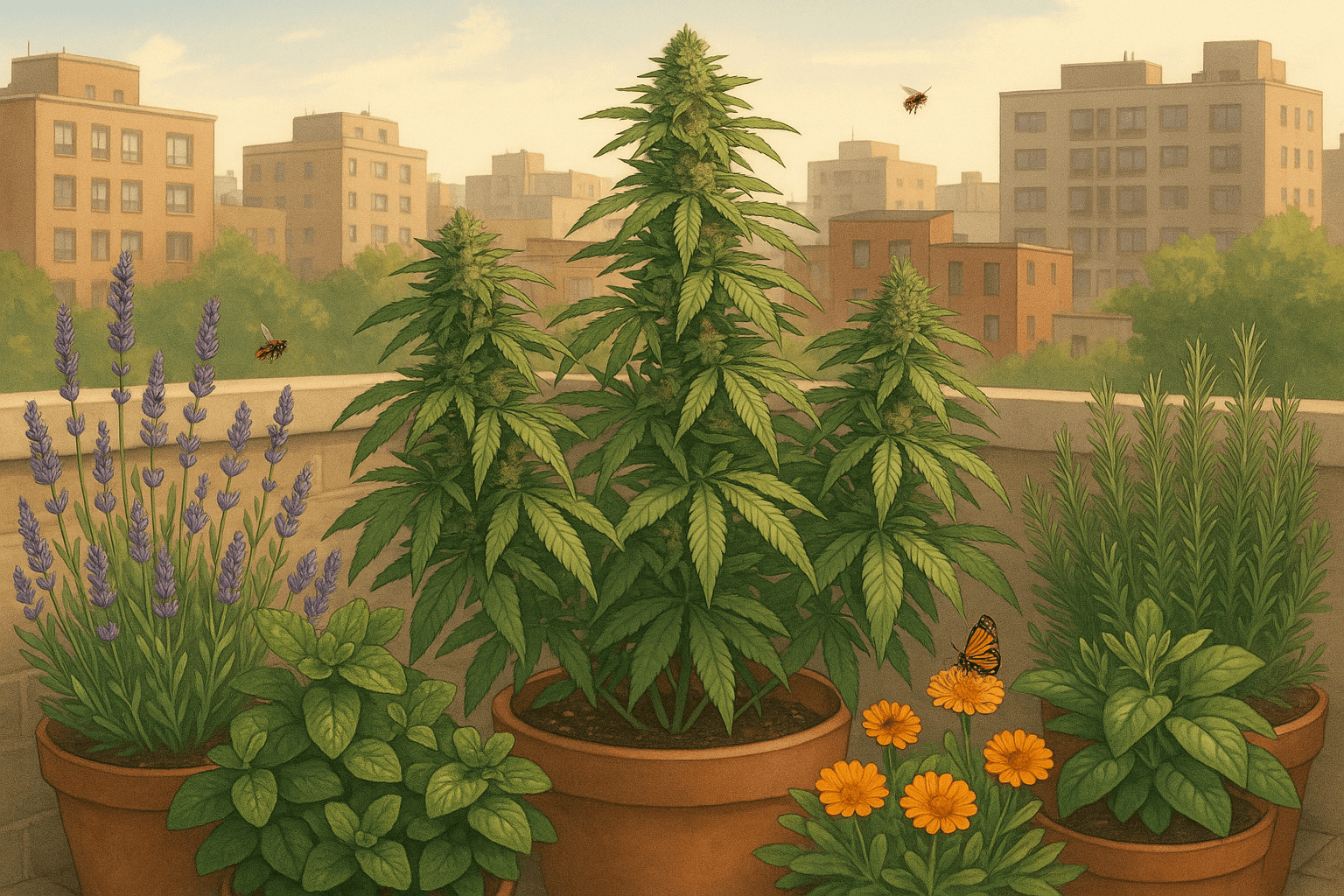 Durante la floración puede ser difícil de controlar en entornos urbanos, y no hay soluciones mágicas para eliminarlo por completo. La mejor estrategia es camuflar el aroma plantando otras plantas aromáticas alrededor del cannabis. Algunas opciones efectivas son: menta, lavanda, romero, albahaca y caléndula, que ayudan a disimular el olor y aportan un ambiente más agradable en la terraza. Además, estas plantas pueden atraer insectos beneficiosos y mejorar la biodiversidad del espacio.