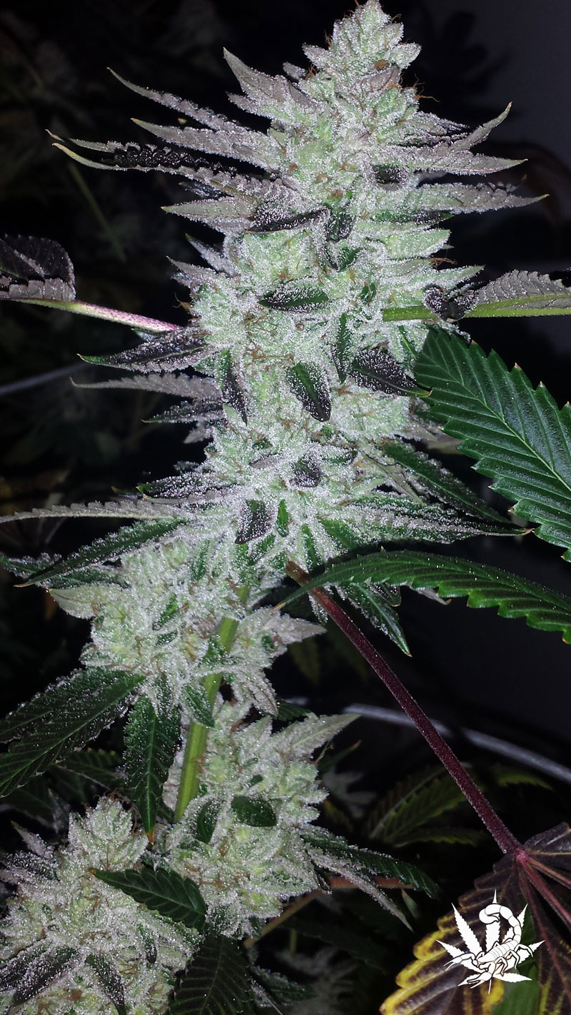 Aspecto de la Flor. Sus colas florales son el orgullo de cualquier cultivador. Desarrolla racimos inmensos, con cálices muy hinchados y una excelente proporción cáliz-hoja. Este rasgo no solo la hace visualmente imponente, sino que reduce enormemente el tiempo que pasarás pelando con las tijeras.